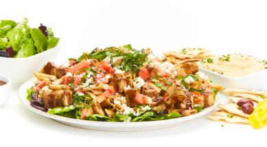 For 4 or 6. Includes Greek salad with dressing, roasted new potatoes or basmati rice, and choice of baked pita chips or soft pita (except signature pasta).